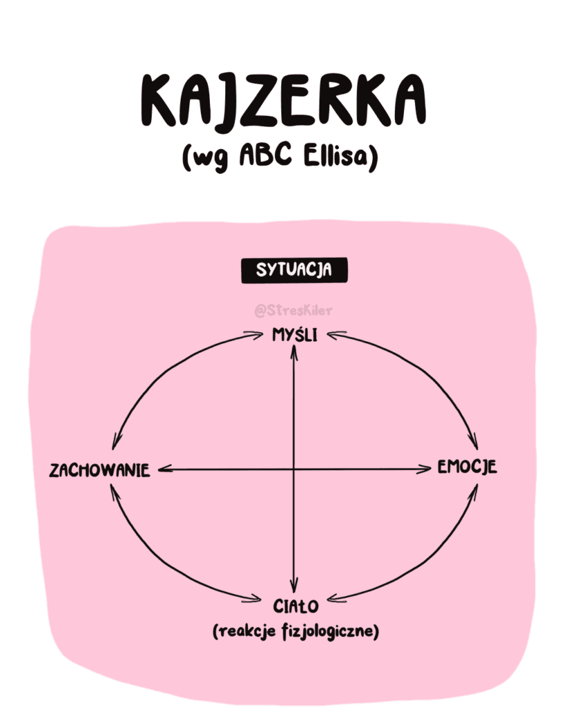 Kajzerka (wg ABC Ellisa) szybko tłumaczy mechanikę „myśl ↔ emocja ↔ ciało ↔ zachowanie”. Jeśli dzień był „za bardzo”, ta mini-mapa pomaga w 60 sekund z chaosu zrobić sens ☝🏼 (uporządkować doświadczenie).
