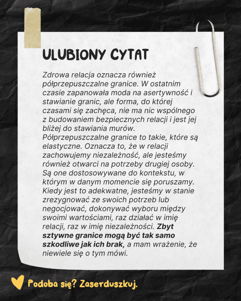 🖤 Najmocniej wybrzmiała dla mnie myśl o granicach: „półprzepuszczalne” granice chronią i łączą – mury izolują. A granice nie powinny być ani murem, ani dziurawym płotem, lecz membraną. Ta „półprzepuszczalność” to elastyczność: zachowuję siebie i jednocześnie jestem w kontakcie z innymi. Nie chodzi o „twarde nie” za wszelką cenę, lecz o dopasowanie do kontekstu: czasem wybieram swoje potrzeby, czasem relację – a najczęściej negocjuję tak, by żadna ze stron nie była w permanentnym deficycie.